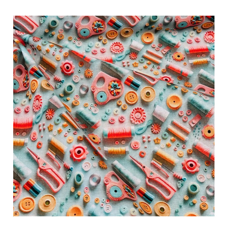 Tissu coton digital imprimé, au motif couture en effet 3D, mettant en scène des accessoires et éléments de mercerie dans une palette turquoise fraîche et dynamique. Son rendu graphique et détaillé apporte profondeur et originalité aux créations. Souple et agréable à travailler, ce coton est idéal pour la couture du quotidien, les accessoires et les projets DIY à l’esprit créatif.