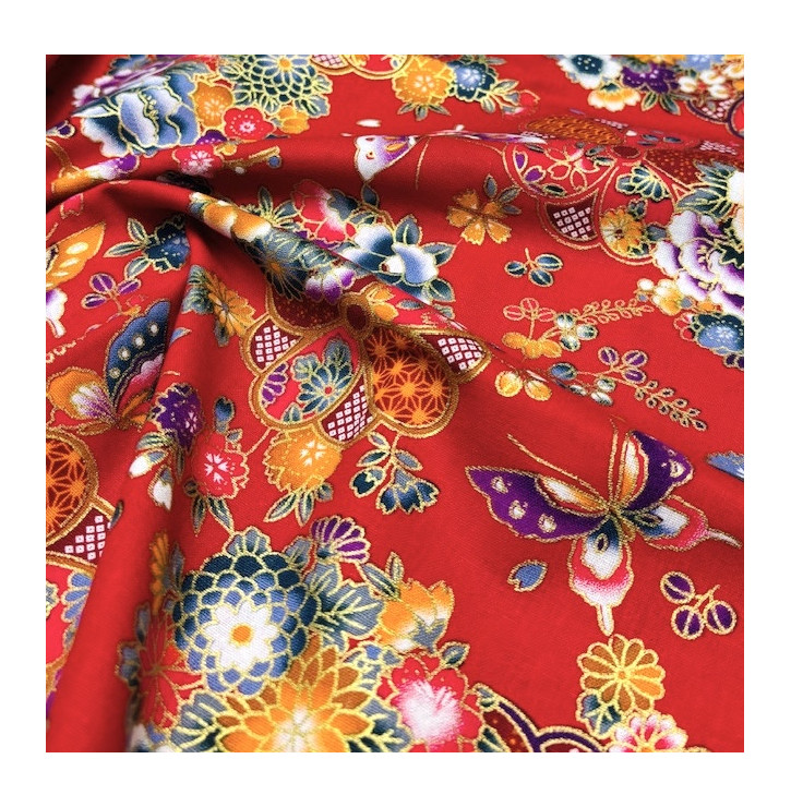 Le coton Foil Wasabi Rouge se distingue par ses motifs floraux d’inspiration japonaise, riches et détaillés, rehaussés de subtils reflets dorés. Son fond rouge profond apporte du caractère et met en valeur chaque détail pour un rendu à la fois élégant et décoratif.
