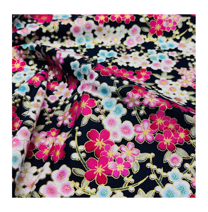 Le coton Foil Naomi Noir séduit par ses motifs floraux délicats, inspirés de l’esthétique japonaise, sublimés par de fines touches dorées. Son fond noir profond met en valeur les fleurs colorées et apporte un contraste élégant, idéal pour des créations couture raffinées et pleines de caractère.