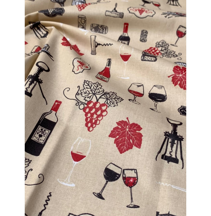 Authentique et chaleureux, le coupon coton enduit Vignoble Lin – 50 x 160 cm met à l’honneur l’univers du vin avec ses motifs de bouteilles, verres, grappes et tire-bouchons dans des tons rouge et noir sur fond lin naturel. Enduction : légère – env. 140 g/m², pour un tissu souple, imperméable et facile à coudre.