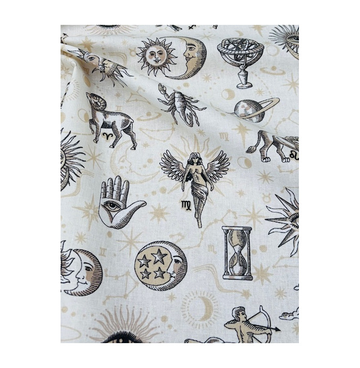 Le coupon coton enduit Astro Écru invite à un voyage entre ciel et symbolisme. Lunes, soleils, signes astrologiques, sabliers et figures célestes se dessinent avec finesse dans une palette sobre et élégante. Le fond écru apporte douceur et lumière, tandis que les motifs noirs et beiges créent un contraste chic et intemporel.