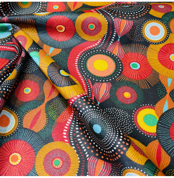 Magnifique coupon de coton enduit Boubou, un imprimé graphique, coloré et plein de caractère : tons noir, rouge, jaune, vert et touches turquoise pour un rendu moderne et vibrant. Tissu 100 % coton avec enduction légère – env. 140 g/m², souple, agréable à coudre et résistant au quotidien. Idéal pour sacs, trousses, accessoires, déco et projets créatifs originaux.
