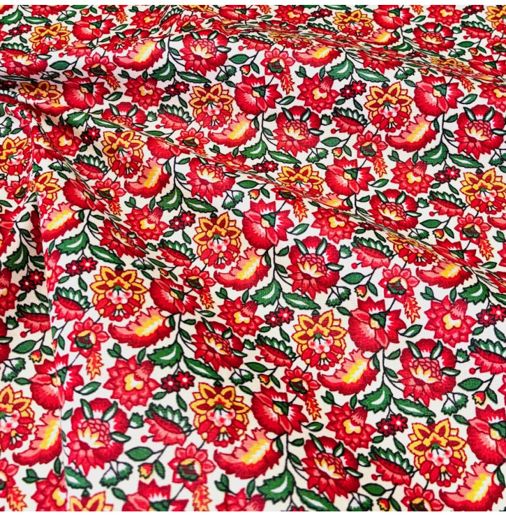 Le coton enduit imprimé Gange Rouge séduit par son motif floral dense et vibrant, mêlant rouges intenses et touches végétales pour un rendu chaleureux et dynamique.