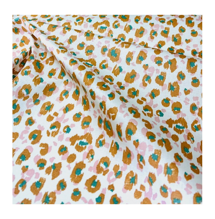Beau coupon de coton enduit Karlia, imprimé léopard beige, brun et kaki. Tissu 100 % coton avec enduction légère – env. 140 g/m², souple, agréable à coudre et résistant pour le quotidien. Idéal pour sacs, trousses, accessoires et déco.