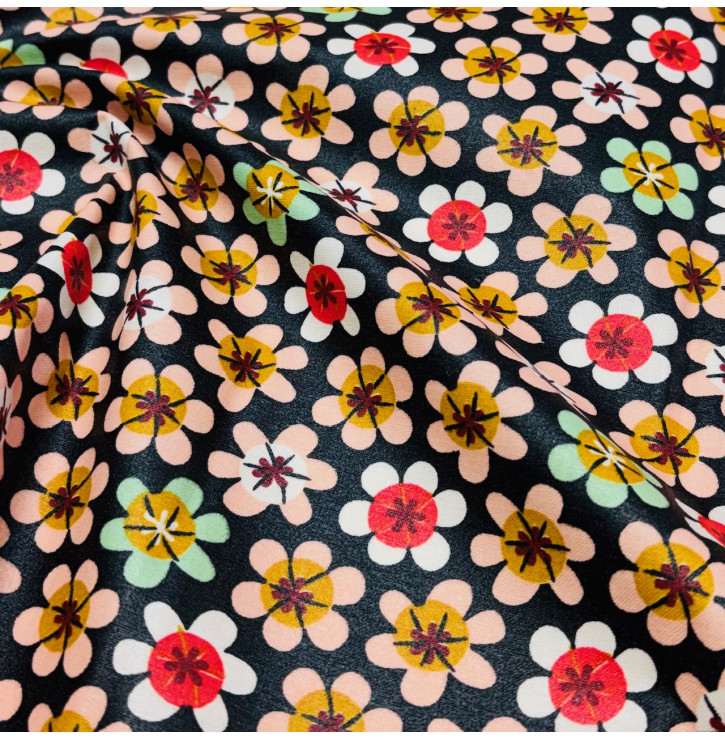 • Coloris : fond noir, fleurs corail / blanc / ocre / vert tendre
