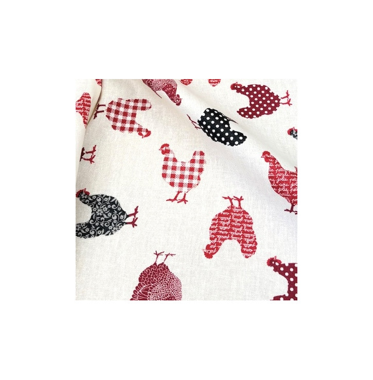 • Motif : petites poules rouges et noires sur fond écru