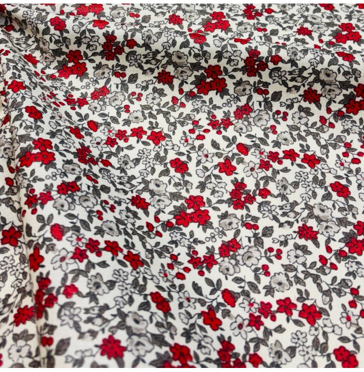 Tissu Coton Enduit / Fleurs Léonie - Beige & Rouge | Coupon