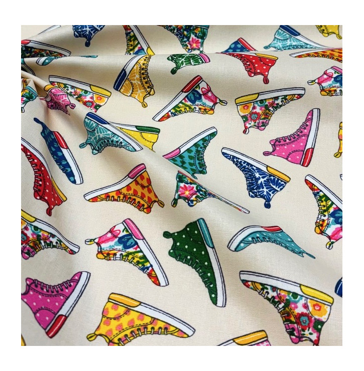 Apportez une touche fun et dynamique à vos créations avec le coton enduit “Baskets” Multicolores ! Idéal pour les accessoires, projets enfants, sacs, trousses et couture du quotidien, il est à la fois pratique, résistant et agréable à coudre.