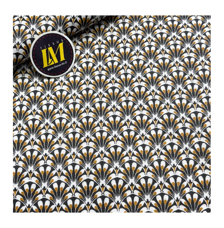 Le coton enduit Gaudi Noir est un tissu imperméable décoratif au motif Art Déco graphique, idéal pour la couture créative et les accessoires du quotidien. Souple et facile à coudre grâce à son enduction légère, il est disponible en coupons prédécoupés.