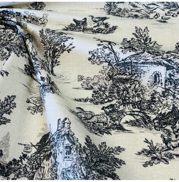 Le coton enduit imprimé Toile de Jouy lin & noir incarne l’élégance à la française. Son motif pastoral finement dessiné, inspiré des scènes champêtres traditionnelles, apporte une touche chic et authentique à vos créations.