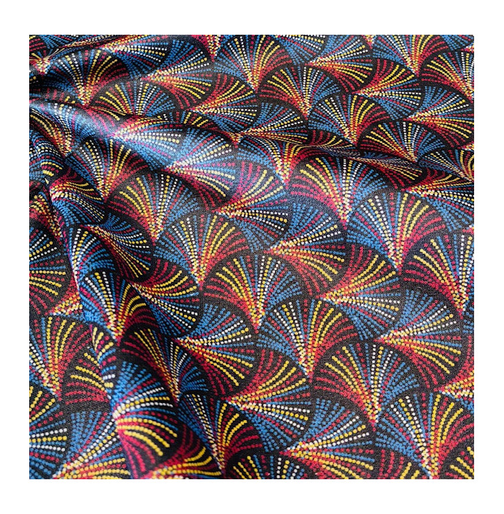 Un superbe coupon de coton enduit graphique et chaleureux, avec son motif esprit plumes / éventails stylisés dans de belles teintes automnales : jaune, orange, ocre et touches sombres pour la profondeur. Un imprimé moderne, décoratif et très élégant.