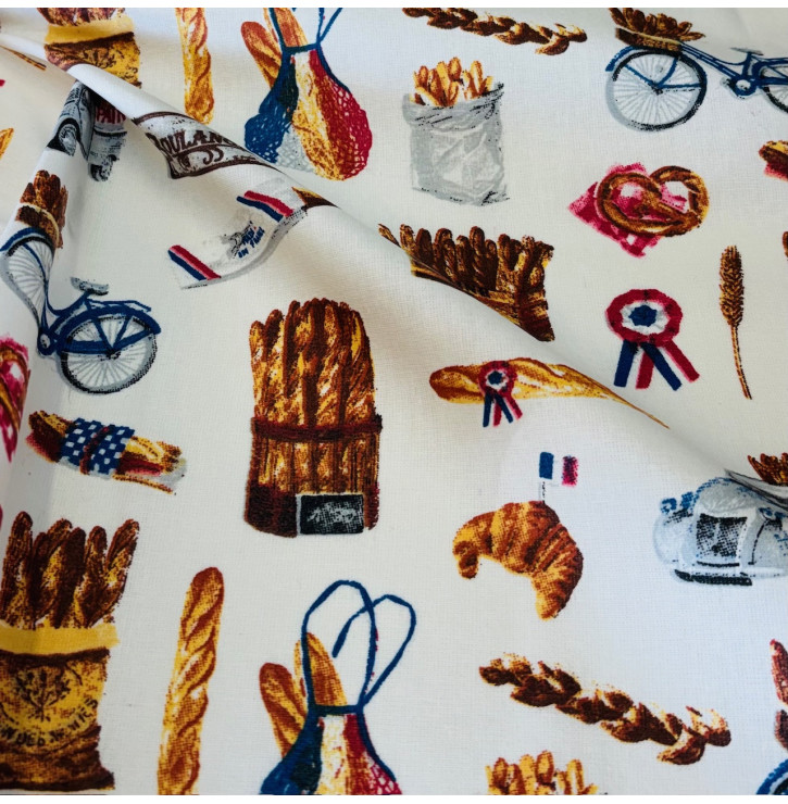 • Motif : univers boulangerie française sur fond ivoire (baguettes, croissants, bicyclettes, éléments tricolores)