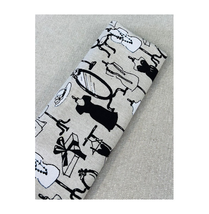 Le tissu Dressing noir rend hommage à la couture sur mesure et à l’élégance intemporelle. Sur un fond beige effet lin, se dessinent des robes noires, bustes de couture, boîtes cadeaux, chaussures et miroirs vintage, dans un style illustré très tendance.
