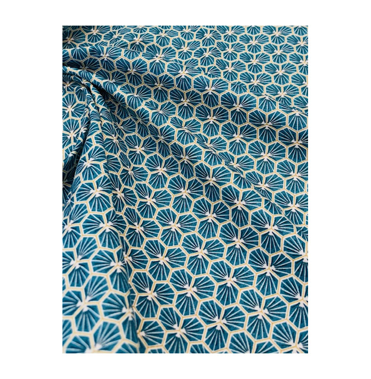 Le coton enduit Riad bleu canard revisite les motifs orientaux traditionnels dans une version moderne et chic. Ses formes cubiques structurées, mêlant bleu canard, or et blanc, apportent une touche graphique forte. Grâce à son enduction acrylique sans PVC, ce tissu reste imperméable, tout en gardant la souplesse du coton.