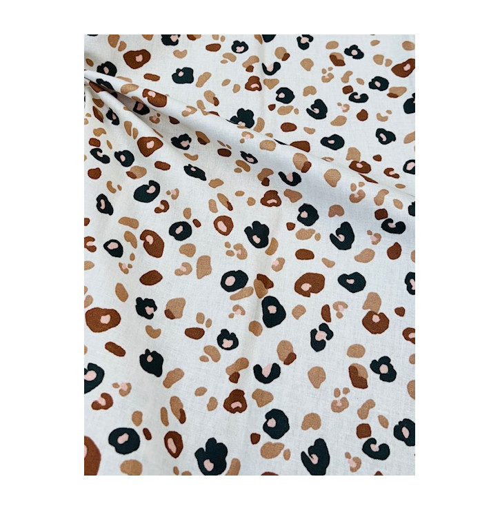 Le coton enduit Felyna Écru Marron revisite l’imprimé léopard avec une touche moderne. Sur un fond écru naturel, des taches noires, brunes et noisette s’éparpillent façon pelage stylisé. L’ensemble est élégant, graphique et original, parfait pour oser un style affirmé dans vos accessoires cousus main.