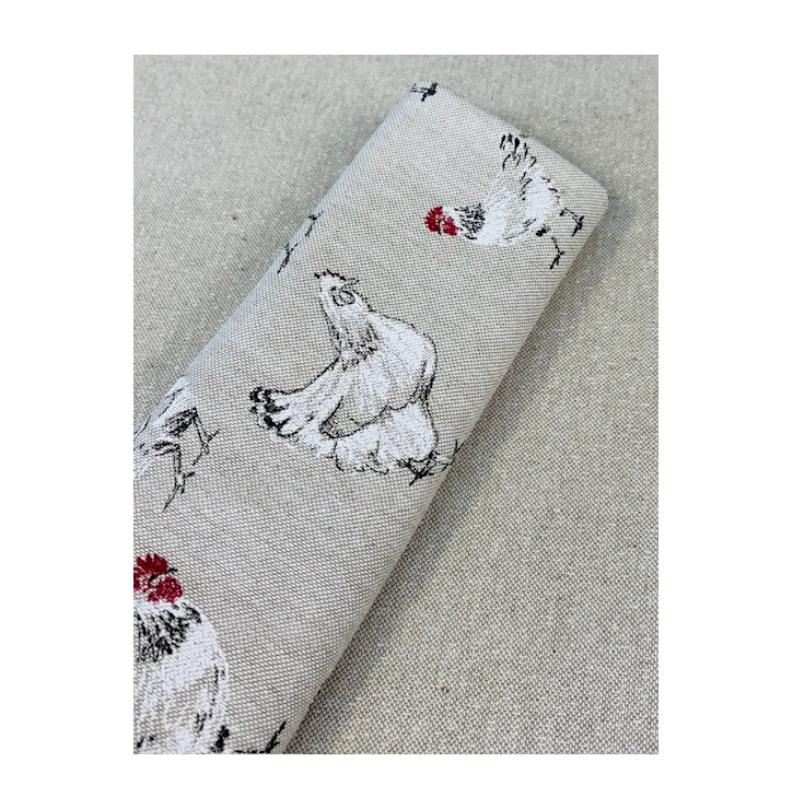 Ce coupon en toile Palace 50 x 140 cm, composé de 75% coton / 25% polyester (≈205 g/m²), présente un élégant motif de poules et coqs dans des tons naturels. Idéal pour accessoires, déco de cuisine et ameublement léger.