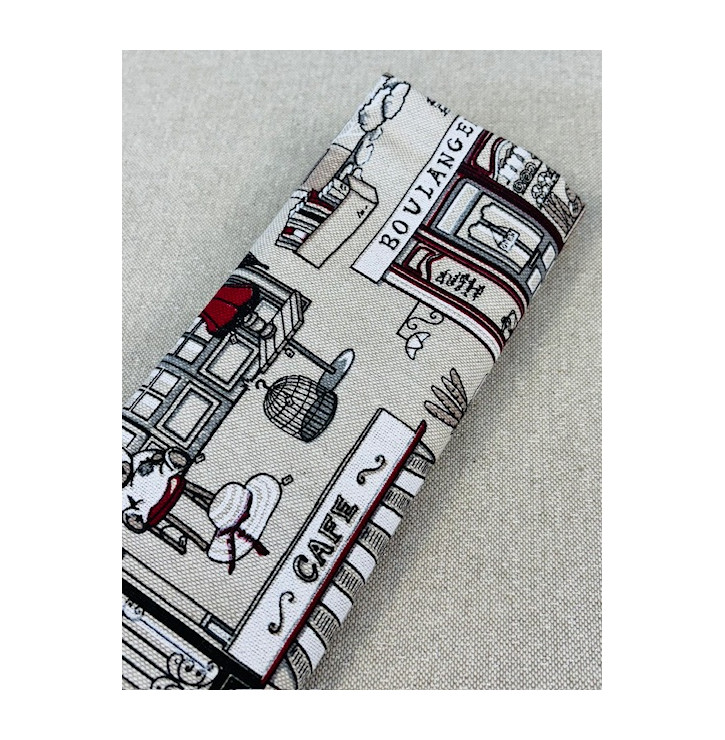 Ce coupon en toile Palace 50 x 140 cm, composé de 75% coton / 25% polyester (≈205 g/m²), présente un motif détaillé de petites boutiques artisanales : brocante, café, boulangerie, librairie… Idéal pour accessoires, déco et ameublement léger.
