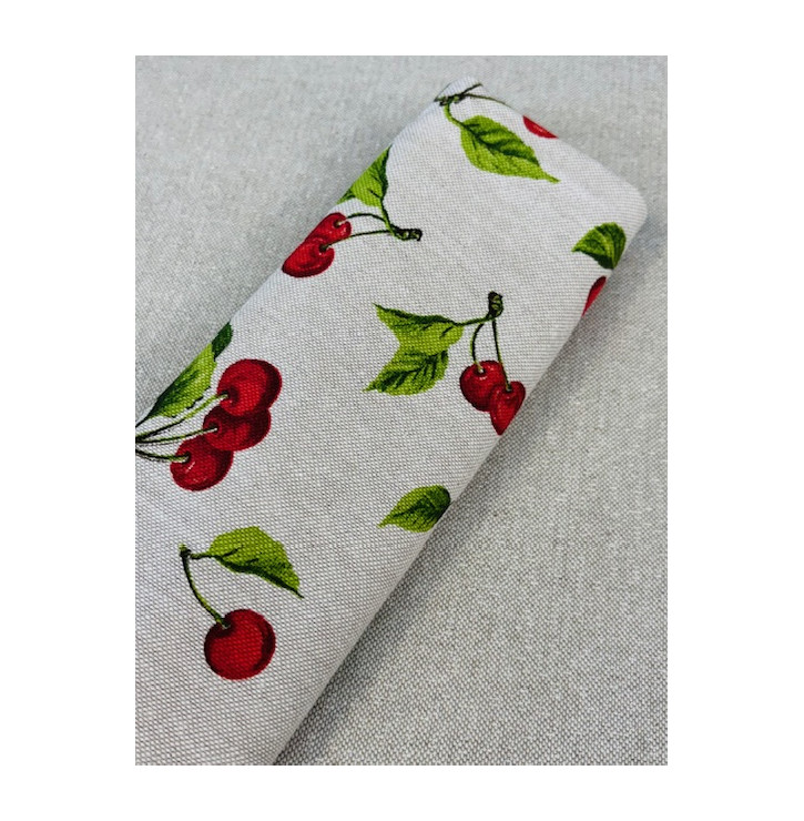 Ce coupon en toile Palace 50 x 160 cm, composé de 75% coton / 25% polyester (≈205 g/m²), présente un ravissant motif de cerises rouges accompagné de feuilles vertes. Parfait pour accessoires, déco de cuisine et ameublement léger.