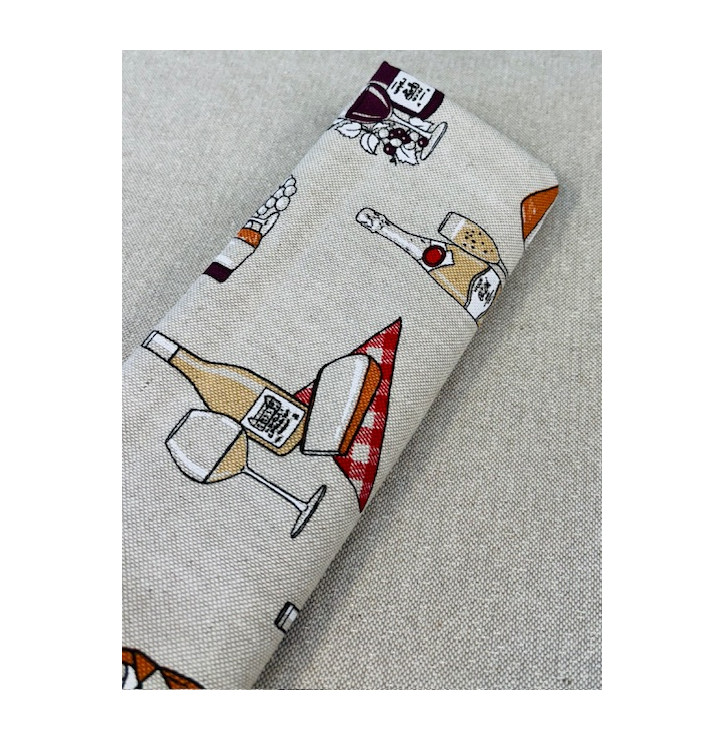 Ce coupon en toile Palace 50 x 140 cm présente un motif convivial sur le thème de l’apéro : vin, fromage, pain, raisins et gourmandises. Un tissu d’ameublement résistant, idéal pour accessoires, déco de cuisine et projets DIY.