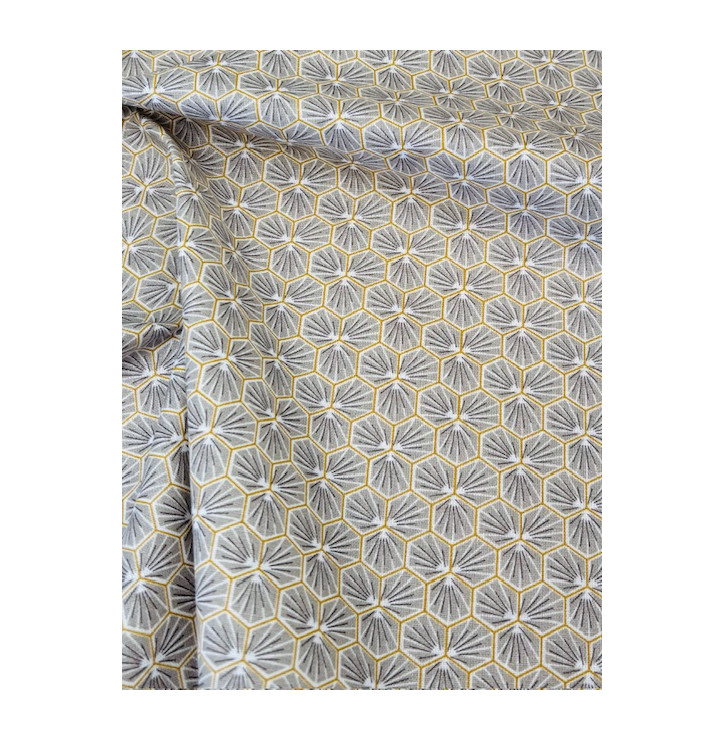 Le coton enduit Riad Taupe reprend les codes des mosaïques orientales, dans une version douce et contemporaine. Son motif étoilé, aux lignes fines et répétées, s’organise dans une harmonie de taupe clair, ocre doré et blanc cassé, évoquant le calme et l’élégance d’un intérieur zen.