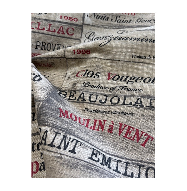 Coupon de tissu Grand Cru Rouge Noir – 50 x 160 cm, 205 g/m². Composition : 75 % coton, 25 % polyester. Motif inspiré des étiquettes de grands vins français (Saint-Émilion, Chablis, Beaujolais, Pauillac…) dans des tons élégants de rouge, noir et beige vieilli. Idéal pour ameublement, déco de cuisine, sets de table, accessoires ou projets DIY au style bistrot chic. Résistant, doux et facile à travailler, parfait pour donner une touche authentique et chaleureuse à vos créations.
