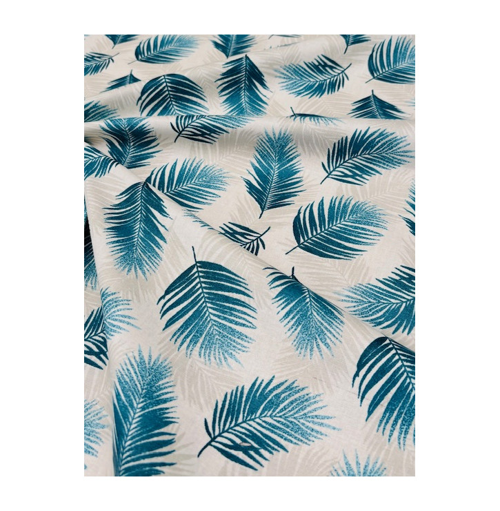 Graphique et élégant, ce coupon de coton enduit “Nassau” coloris canard séduit par son motif feuillage au style tropical chic.