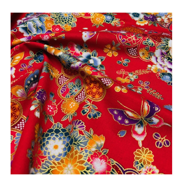 Le Coton Foil “Wasabi” – Rouge se distingue par son fond rouge intense, sublimé par une profusion de fleurs, papillons et motifs décoratifs richement travaillés. Les détails dorés foil apportent un éclat subtil, élégant et chaleureux, parfait pour donner du caractère à vos créations.