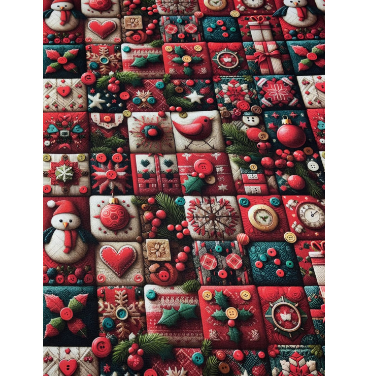 Ce tissu en sergé de coton, proposé en coupon 50 x 160 cm, présente un joli motif patchwork de Noël rouge avec détails décoratifs festifs. Parfait pour créer accessoires, déco, pochettes, lingettes et projets DIY.