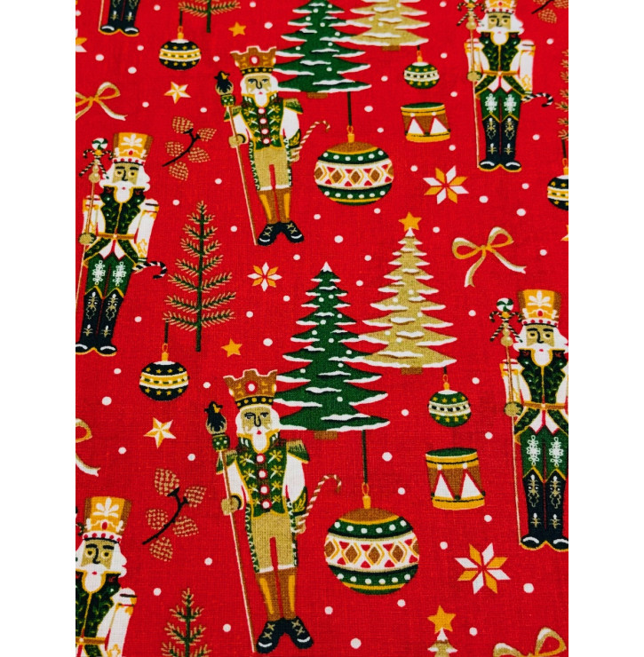 Coupon coton 1m x 150 cm motif Casse-Noisette Vintage : fond Rouge Noël, sapins, boules, tambours et soldats festifs. Parfait déco & couture de Noël.