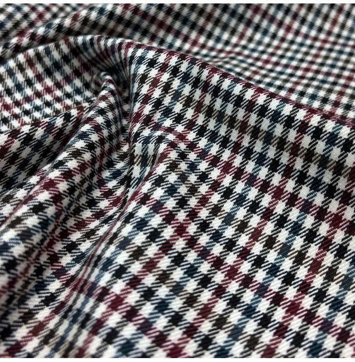 Le tissu Écossais Petits Carreaux Bordeaux/Noir offre un motif fin et élégant, mêlant subtilement le bordeaux, le noir et quelques touches écrues. L’ensemble crée une harmonie moderne et chaleureuse, parfaite pour des créations intemporelles au style graphique discret.
