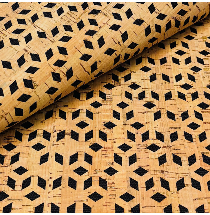 Apportez une touche moderne à vos créations avec ce coupon de liège 3D entoilé effet jeans, sublimé par un motif géométrique de losanges noirs. Un tissu graphique, résistant et facile à coudre, idéal pour la maroquinerie et les accessoires DIY.