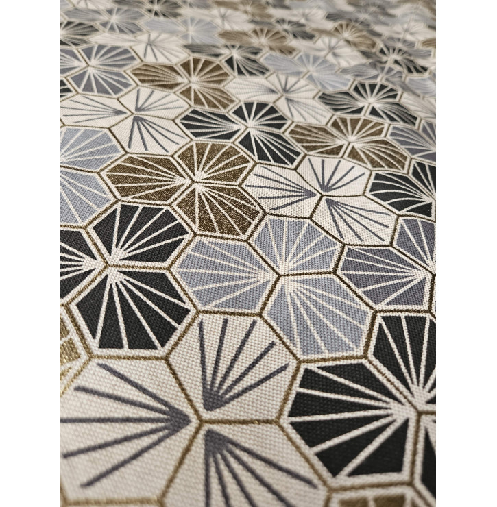 Coupon en toile Palace 50 x 70 cm, décoré d’un motif géométrique gris, noir et doré avec effet foil métallisé. Idéal accessoires et déco moderne.