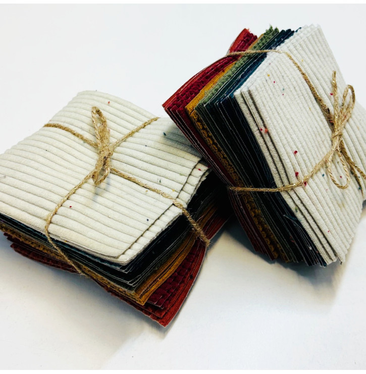 Découvrez ce pack exclusif de 23 coupons velours côtelé 5 mm, coupés en 11 × 11 cm, réunissant 7 couleurs tendance : écru, marine, sapin, kaki, ocre, lie de vin et terracotta. Une matière douce, texturée et chaleureuse, idéale pour vos appliqués, patchworks, décorations et accessoires couture. Un indispensable pour les créatrices et ateliers.