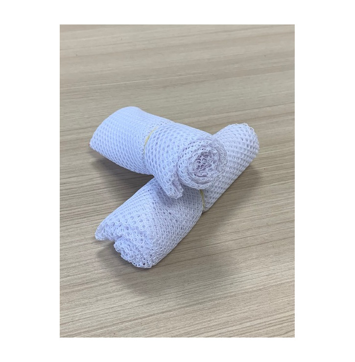 Coupon filet mesh blanc 50 x 70 cm en 100% polyester, maille 5 mm. Souple, respirant et solide. Idéal sacs à vrac, poches filet et accessoires de rangement.