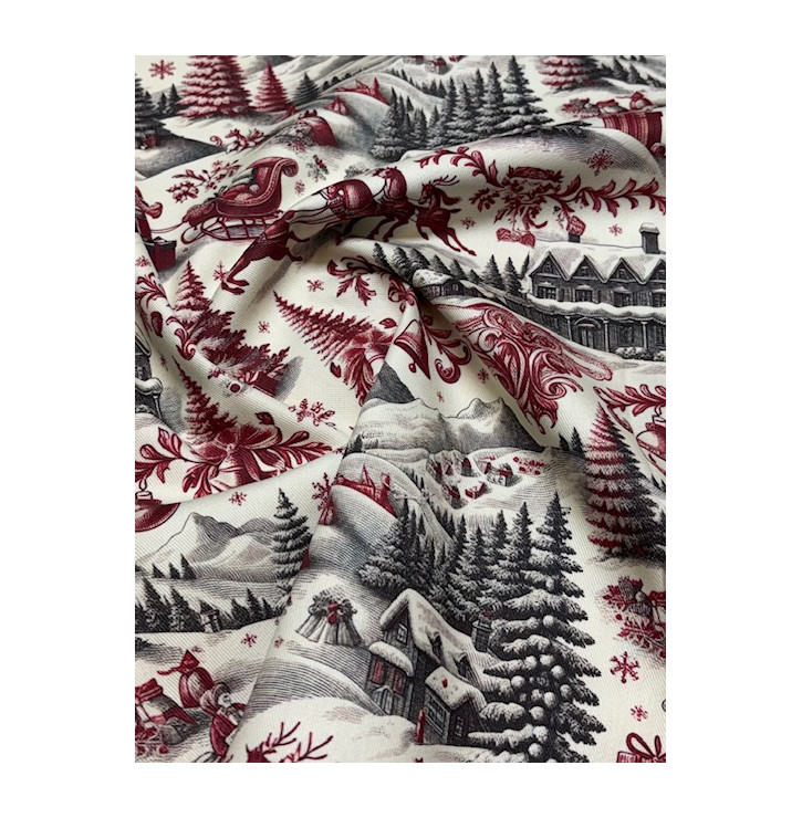 Ce tissu en sergé de coton, présente une superbe scène de Noël rouge et gris : traîneau, village enneigé, sapins et détails hivernaux. Idéal pour déco, accessoires et projets DIY festifs.