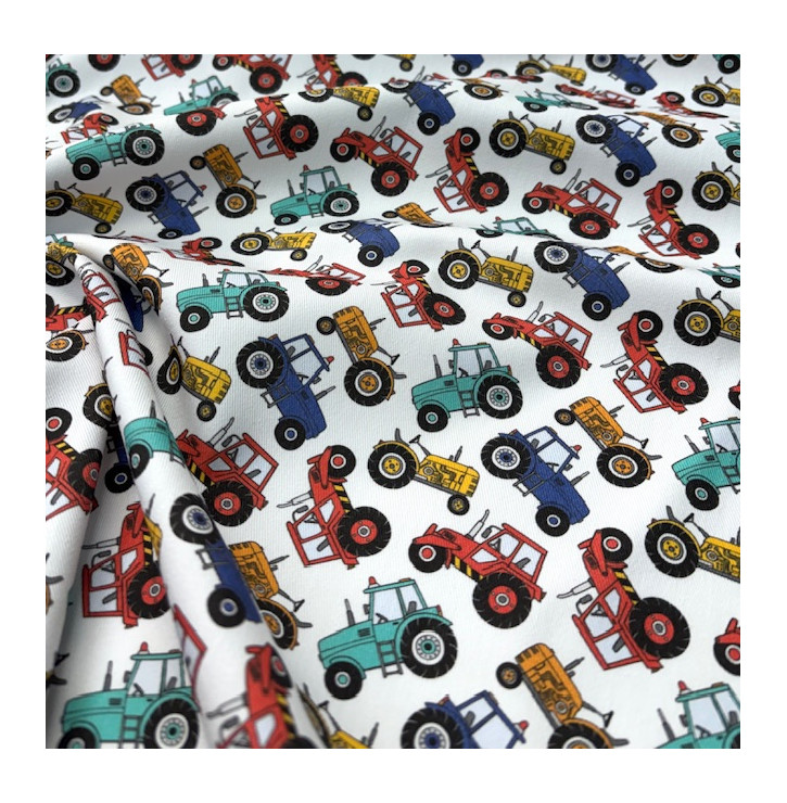 Ce sergé de coton naturel se distingue par son tissage diagonal qui lui apporte une belle tenue tout en restant souple et agréable à coudre Le fond blanc lumineux met en valeur les tracteurs colorés qui composent un motif dynamique et amusant