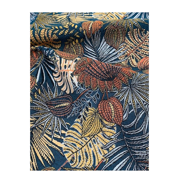 Explorez la richesse de la nature avec le Jacquard Douce Jungle, un tissu tissé au motif végétal dense et coloré. Entre feuilles de palme, fougères, coques exotiques et textures naturelles, ce tissu jacquard mêle teintes moutarde, ocre, rouille et crème, sur un fond bleu canard intense. Parfait pour des créations déco, accessoires couture ou projets DIY d’inspiration jungle douce.
