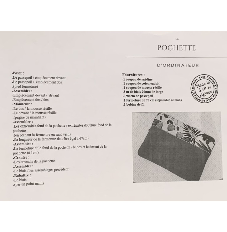 Accessible aux débutants comme aux couturières plus expérimentées, ce projet permet de travailler des matières adaptées à la protection du matériel électronique telles que le coton, la toile, le coton enduit, le simili cuir ou l’ajout de mousse / ouatine pour un meilleur amorti. Le modèle est pensé pour un usage quotidien et un transport sécurisé.