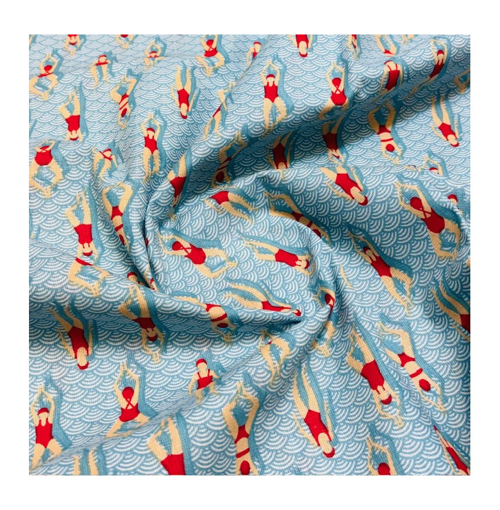 Tissu coton imprimé Swimming Pool, au motif graphique d’inspiration rétro, mêlant des tons bleu et rouge pour un rendu dynamique et estival. Souple et agréable à travailler, ce coton est idéal pour la couture du quotidien comme pour des projets créatifs au style affirmé. Parfait pour les accessoires, les vêtements légers, les créations enfant et les projets DIY.