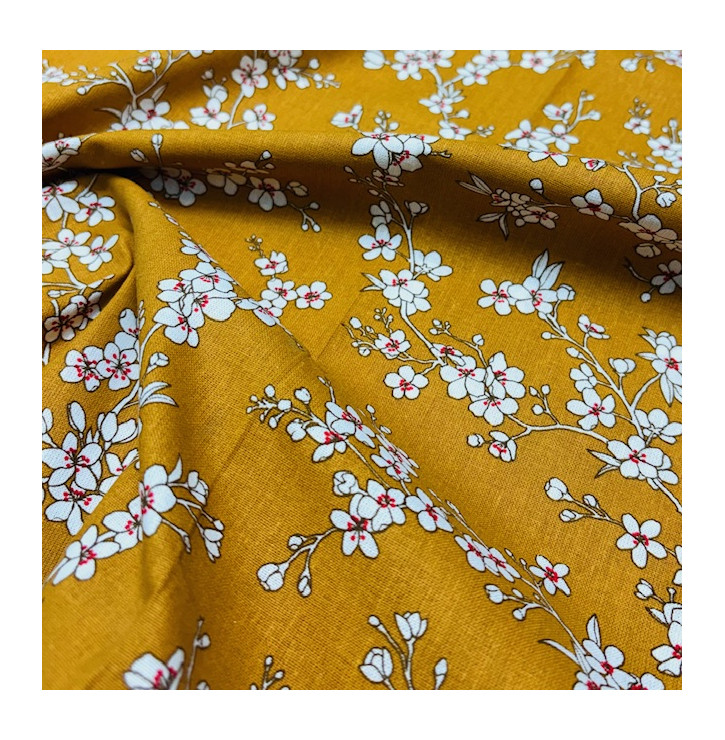 Tissu coton imprimé Osaka, au motif floral fin et élégant, décliné dans une teinte jaune moutarde chaleureuse. Souple et agréable à travailler, ce coton est parfaitement adapté à la couture du quotidien comme aux projets créatifs. Idéal pour les accessoires, les vêtements légers, les créations enfant et les projets DIY.