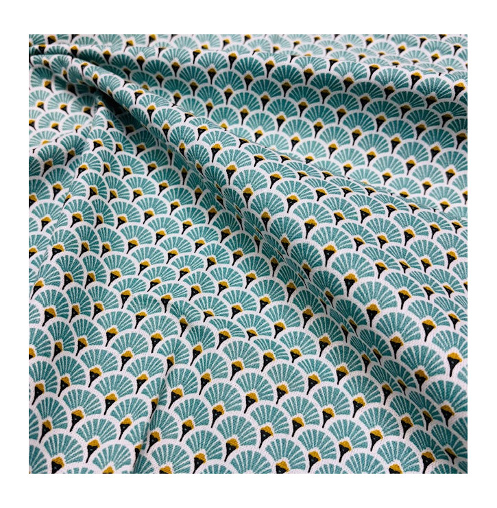 Tissu coton imprimé Éventails, au motif raffiné d’inspiration japonaise, associant un bleu turquoise lumineux à de délicates touches dorées. Élégant et décoratif, ce coton apporte caractère et finesse aux projets de couture créative. Souple et agréable à travailler, il est idéal pour les accessoires, les vêtements légers, la décoration textile et les projets DIY.
