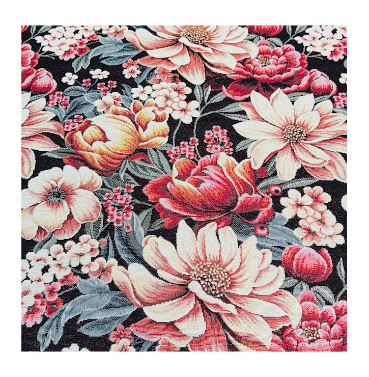 Avec son motif floral inspiré des tapisseries anciennes, le jacquard Jardin Nocturne affirme un style fort et intemporel. Les fleurs généreuses, travaillées dans des tons doux et chaleureux, contrastent harmonieusement avec un fond sombre profond, pour un rendu visuel chic et structuré.