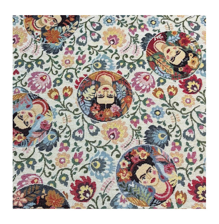 Le jacquard Muse Mexicaine est un tissu décoratif au caractère fort, mêlant portraits féminins stylisés et motifs floraux riches. Son tissage jacquard apporte relief, profondeur et excellente tenue, idéal pour des créations couture décoratives et des accessoires au style affirmé.