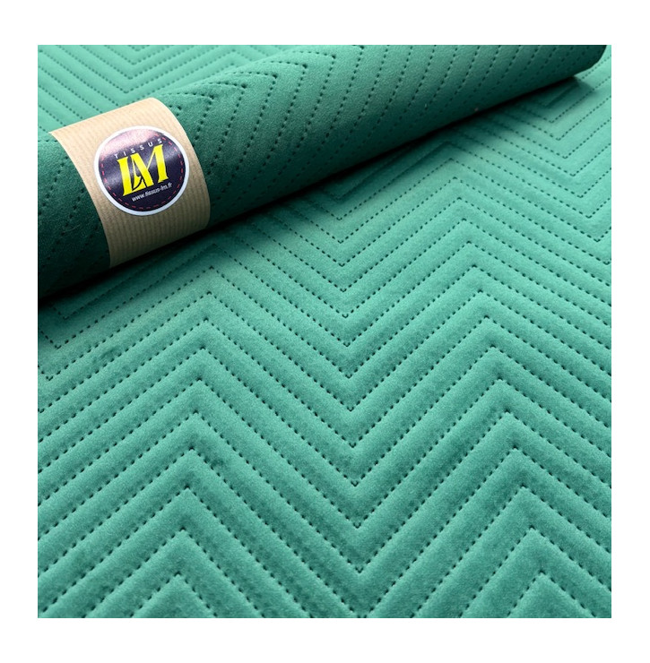 Apportez profondeur et élégance à vos créations avec ce tissu velours matelassé chevron au coloris vert foret à la fois chic et contemporain