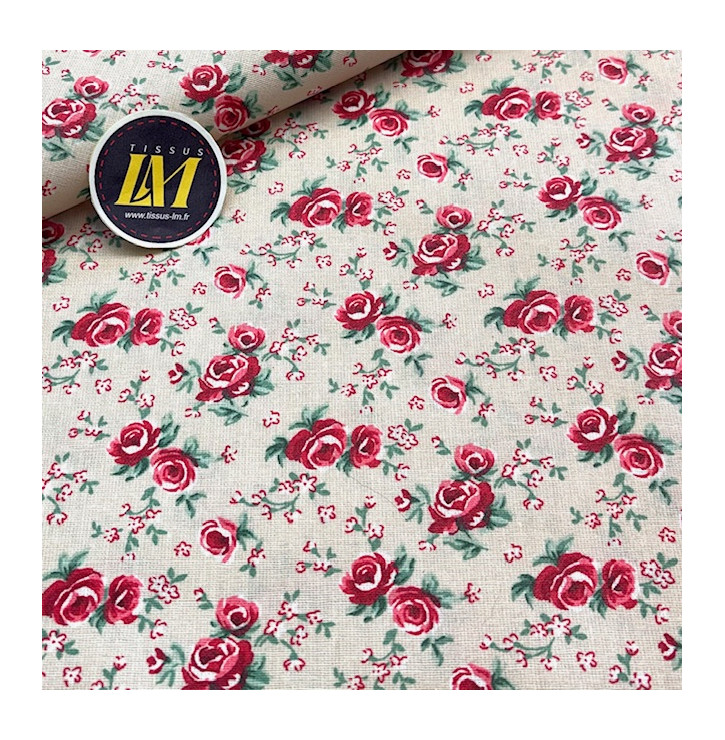 Le coton enduit imprimé Suzanne lin et rouge séduit par son motif floral délicat, où de petites roses rouges viennent sublimer un fond lin doux et naturel. Une combinaison intemporelle qui apporte une touche chaleureuse et authentique à vos créations.