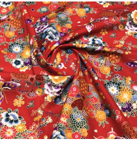 Le coton Foil Obi Rouge séduit par son motif d’inspiration japonaise, mêlant éventails traditionnels et fleurs délicates, rehaussés de subtils reflets dorés. Son fond rouge intense apporte profondeur et caractère, tout en mettant en valeur chaque détail du motif pour un rendu riche et raffiné.