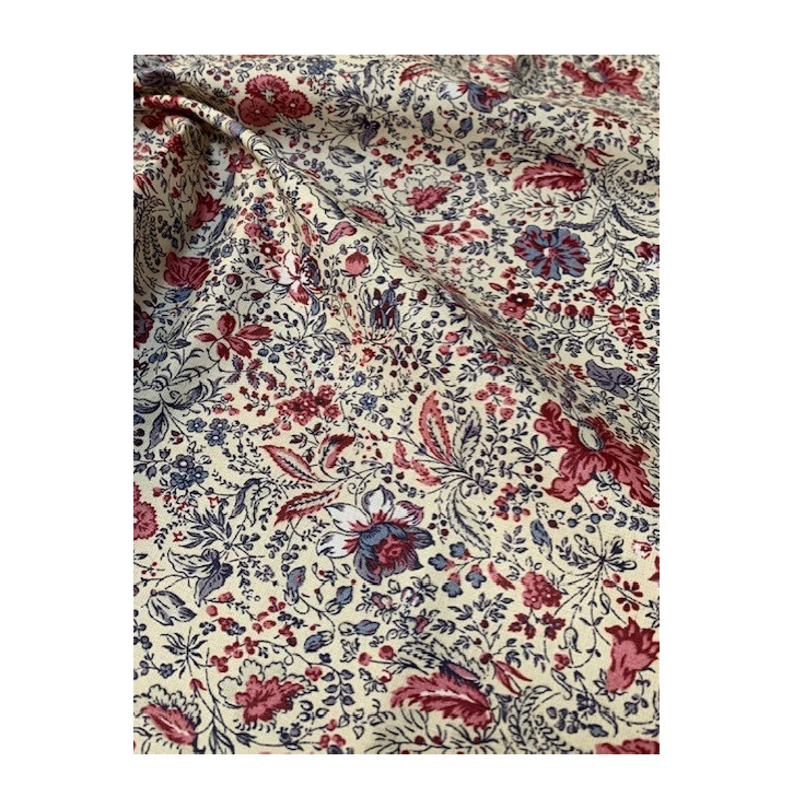 Laissez-vous envelopper par le charme classique et chaleureux de ce coton enduit imprimé “Mini Indienne”. Son motif floral finement dessiné, mêlant bordeaux profond, bleu doux et écru, apporte une atmosphère cocooning et élégante à toutes vos créations couture. Un imprimé intemporel qui traverse les saisons avec style.