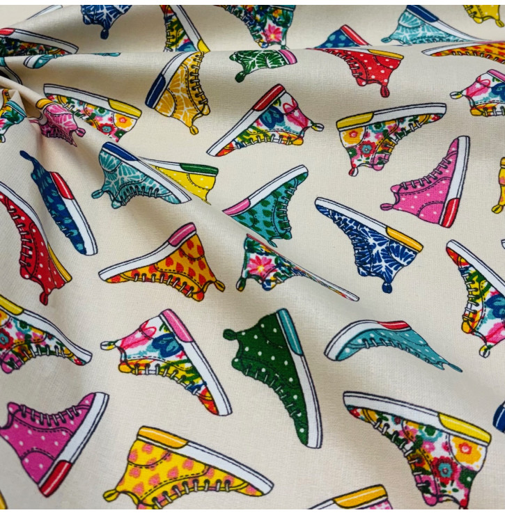 Avec son imprimé dynamique de baskets multicolores, ce coton enduit imprimé apporte immédiatement une touche fun, créative et contemporaine à vos projets couture. Les formes variées et les couleurs vives ressortent élégamment sur un fond clair, offrant un rendu à la fois graphique et chaleureux.