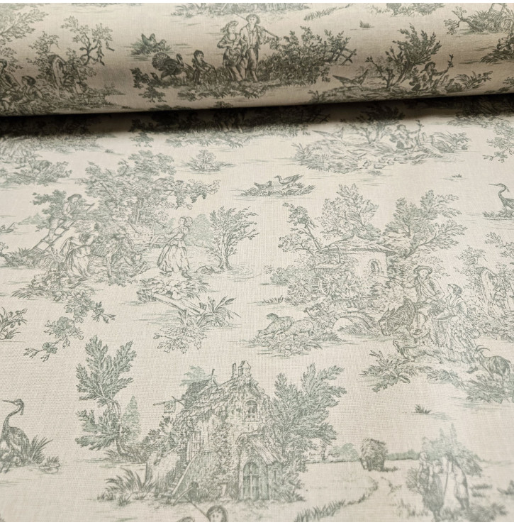 Le coupon coton enduit « Mini Pastorale » Lin Vert s’inspire des gravures anciennes et de l’esprit toile de Jouy. Les scènes rurales délicatement dessinées en vert doux se détachent sur un fond lin naturel, créant une atmosphère apaisante, authentique et raffinée.
