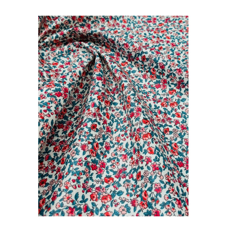 Le coton enduit “Léonie” corail séduit par son imprimé floral fin et harmonieux, mêlant petites fleurs corail, rose et feuillage bleuté sur fond clair. L’ensemble crée une ambiance chaleureuse, douce et élégante, parfaite pour des créations à la fois pratiques et décoratives.